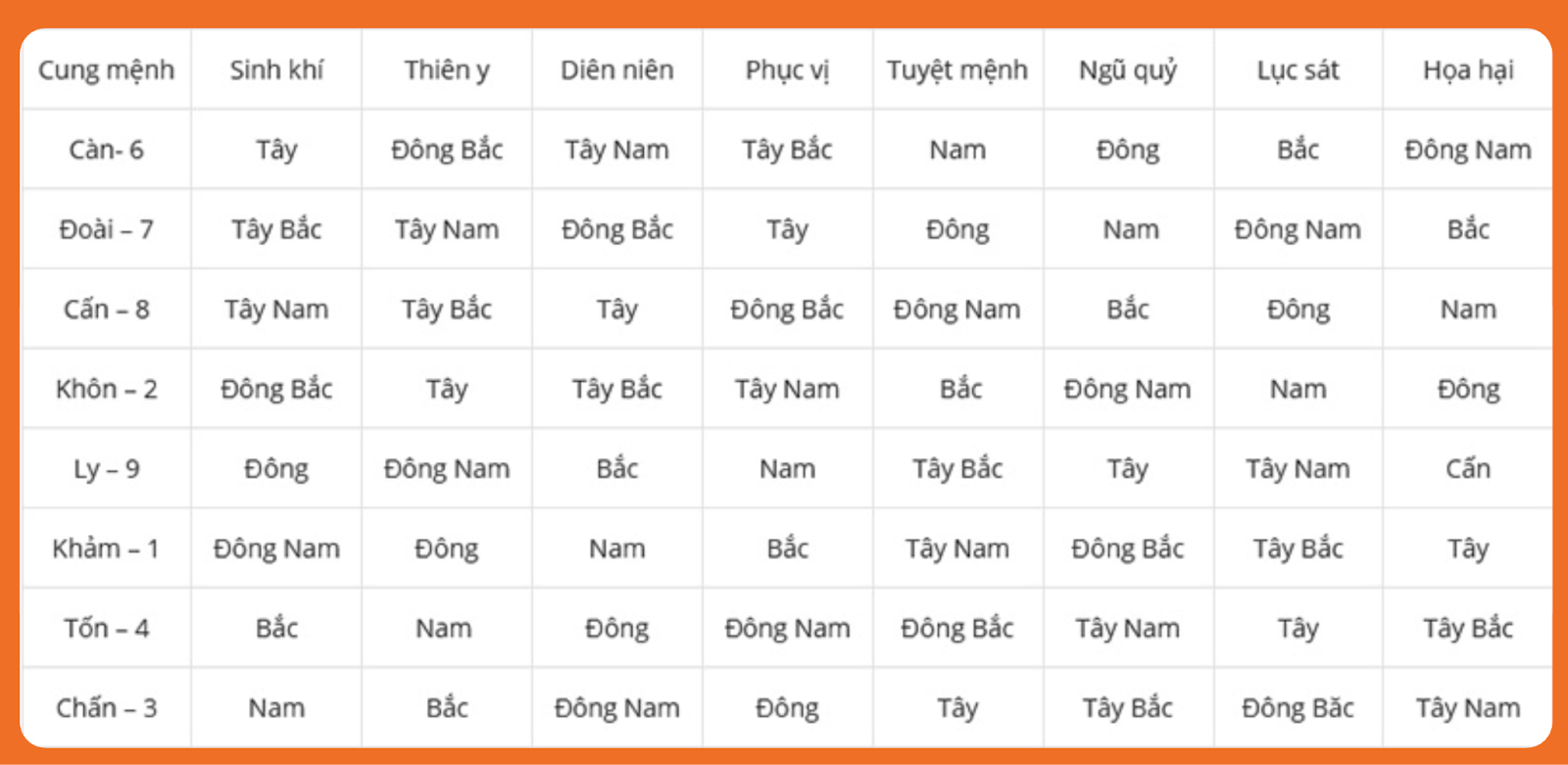 Những hướng này được xếp chung vào nhóm Tây Tứ Trạch và thường phù hợp với những gia chủ có quái số 2 – 6 – 7 – 8.