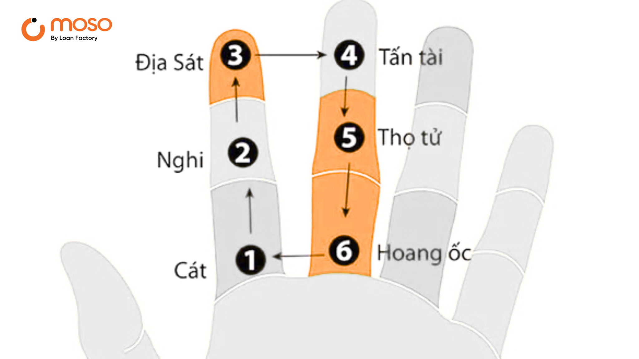 Tuổi Hoang Ốc chia vòng ra làm 6 cung (tương ứng với 6 đốt ngón tay trỏ và giữa của bàn tay trái) và đếm tuổi theo thứ tự từ cung thứ nhất đến cung thứ 6 rồi quay lại cung thứ nhất và đếm tiếp đến số tuổi cần tính. 6 cung gồm: